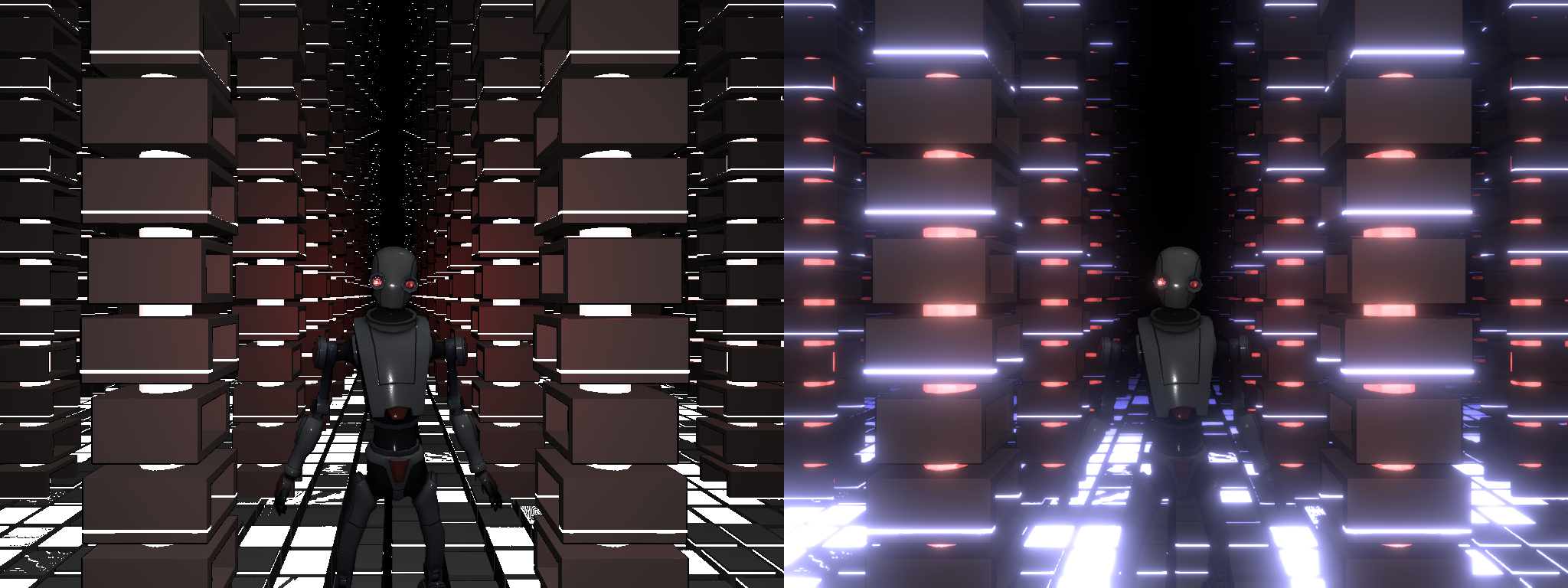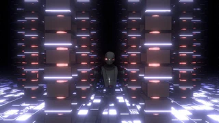 「レイマーチングで動的に生成したモデル」と「ポリゴンメッシュのモデル」を混在させた作品です。 ロボットは通常の3Dモデルですが、床や柱のモデルはレイマーチングでプロシージャルに生成しました。
