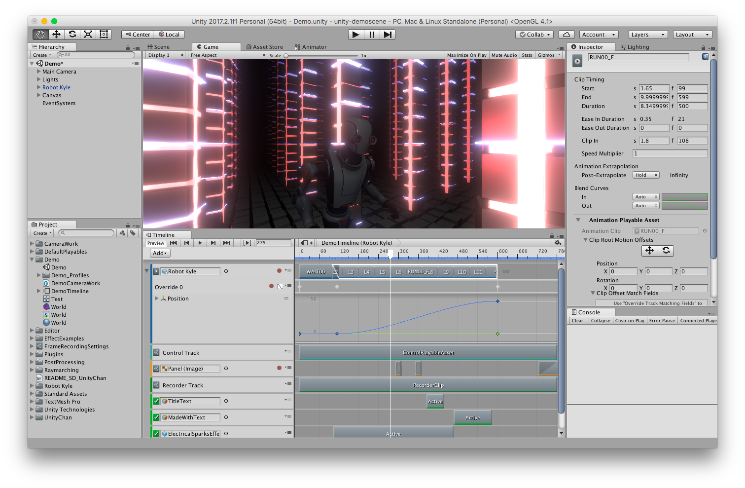 Unity2017のTimeline機能でカメラワークやロボットの動き、UI上のテキストなどの演出の制御をしました。