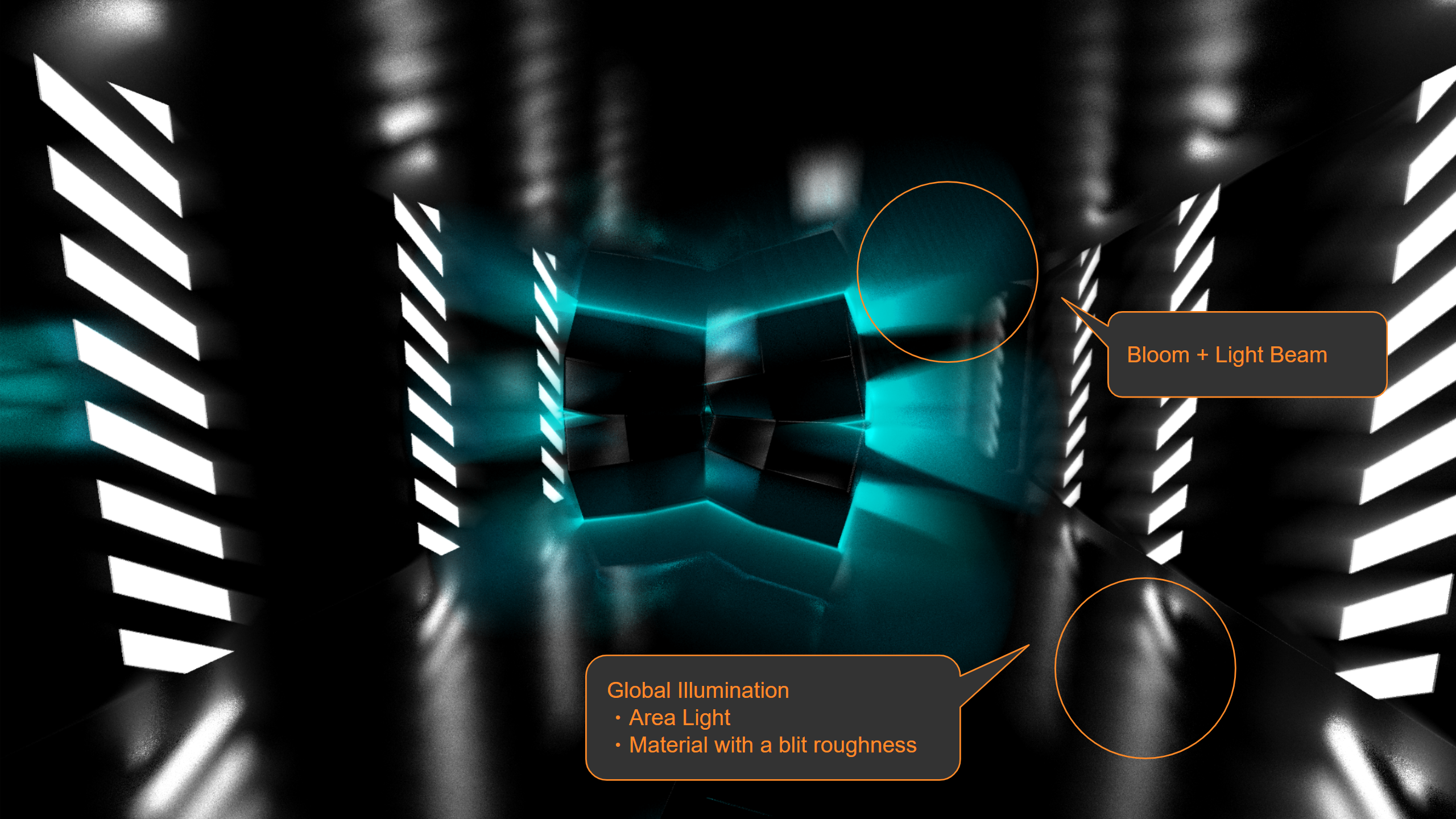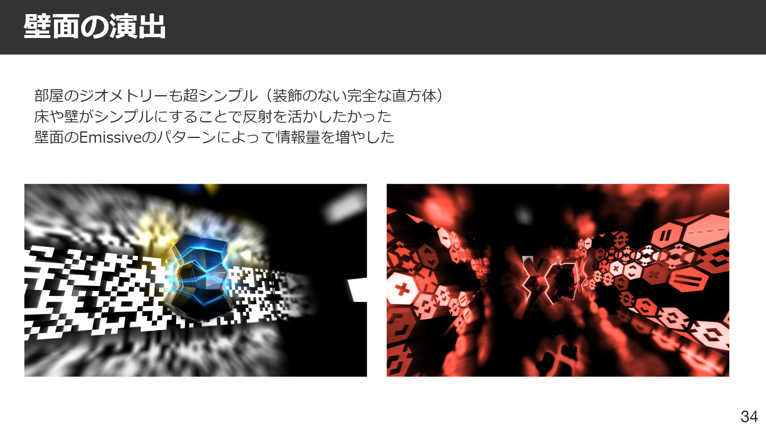 壁面の発光パターンが床に反射する様子が非常にクールだったので、作品の演出に取り入れました。