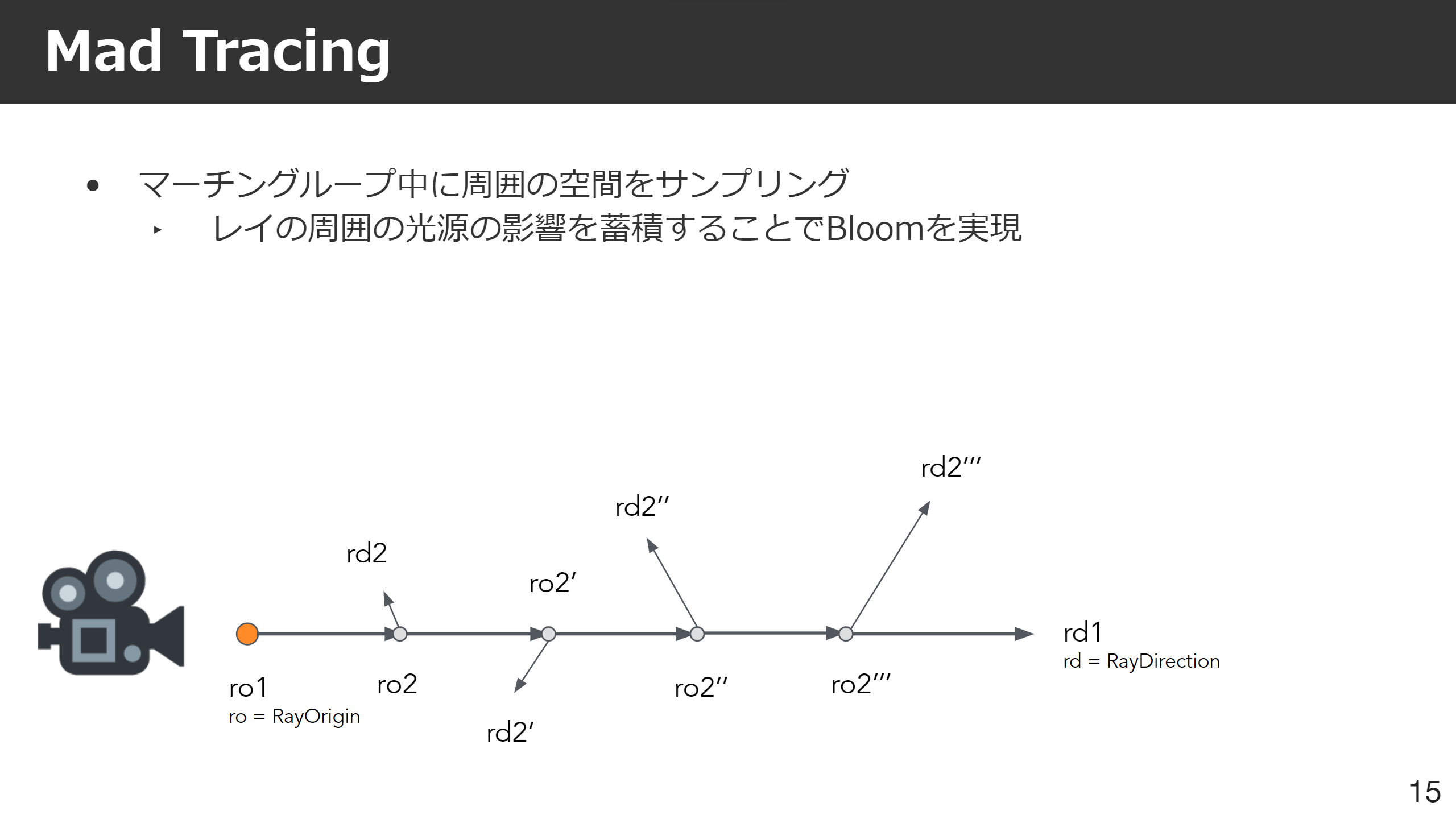 Mad Tracingをざっくり説明すると、Path Tracingの亜種のような手法です。 通常のPath Tracingでは、Bloom効果を実現することはできませんが、Mad TracingではBloom効果も含めて計算することが可能です。