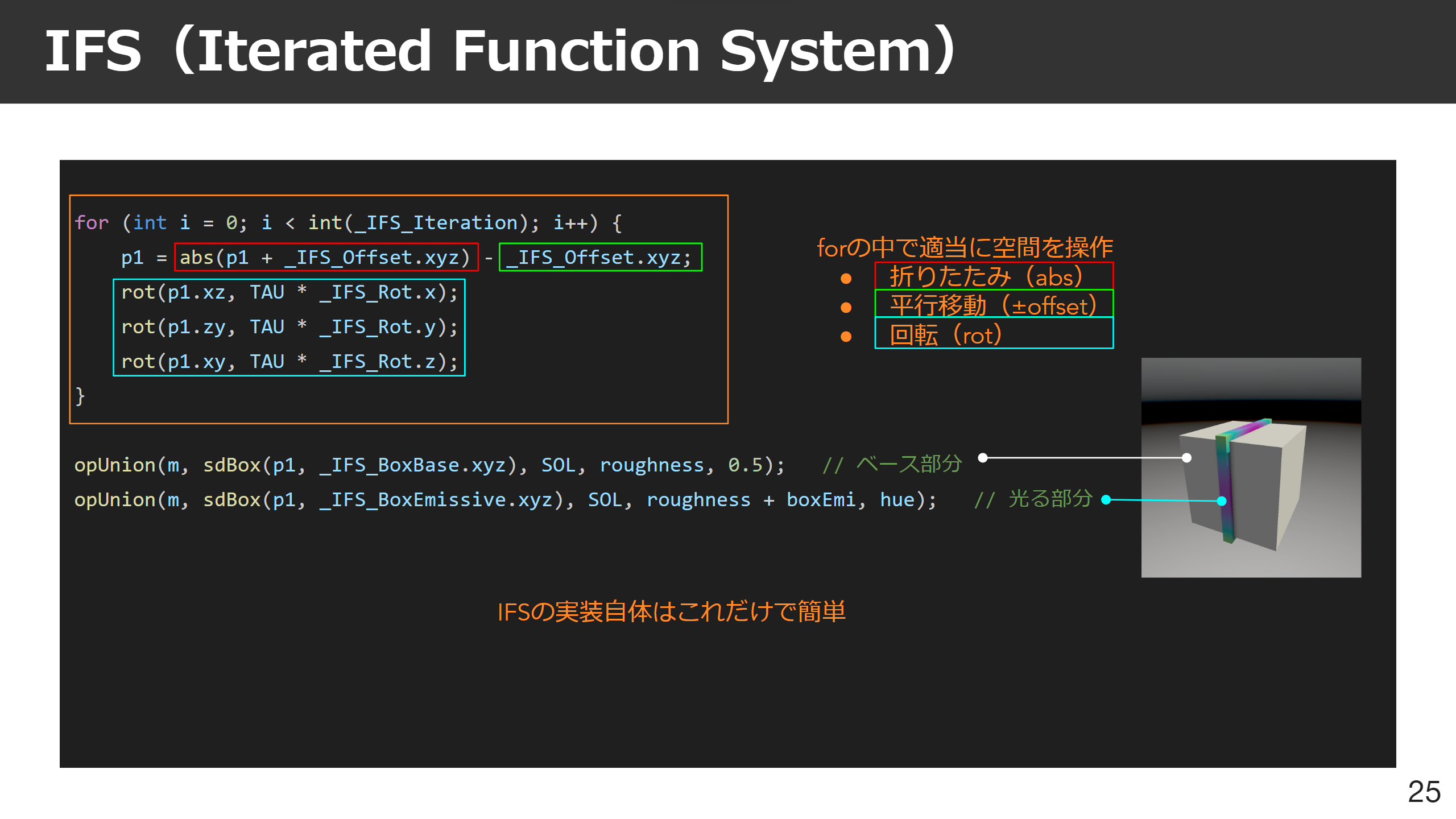 IFSについては、@gaziya5さんのSDF for raymarching (距離関数のスキル)の記事がとても参考になります。
