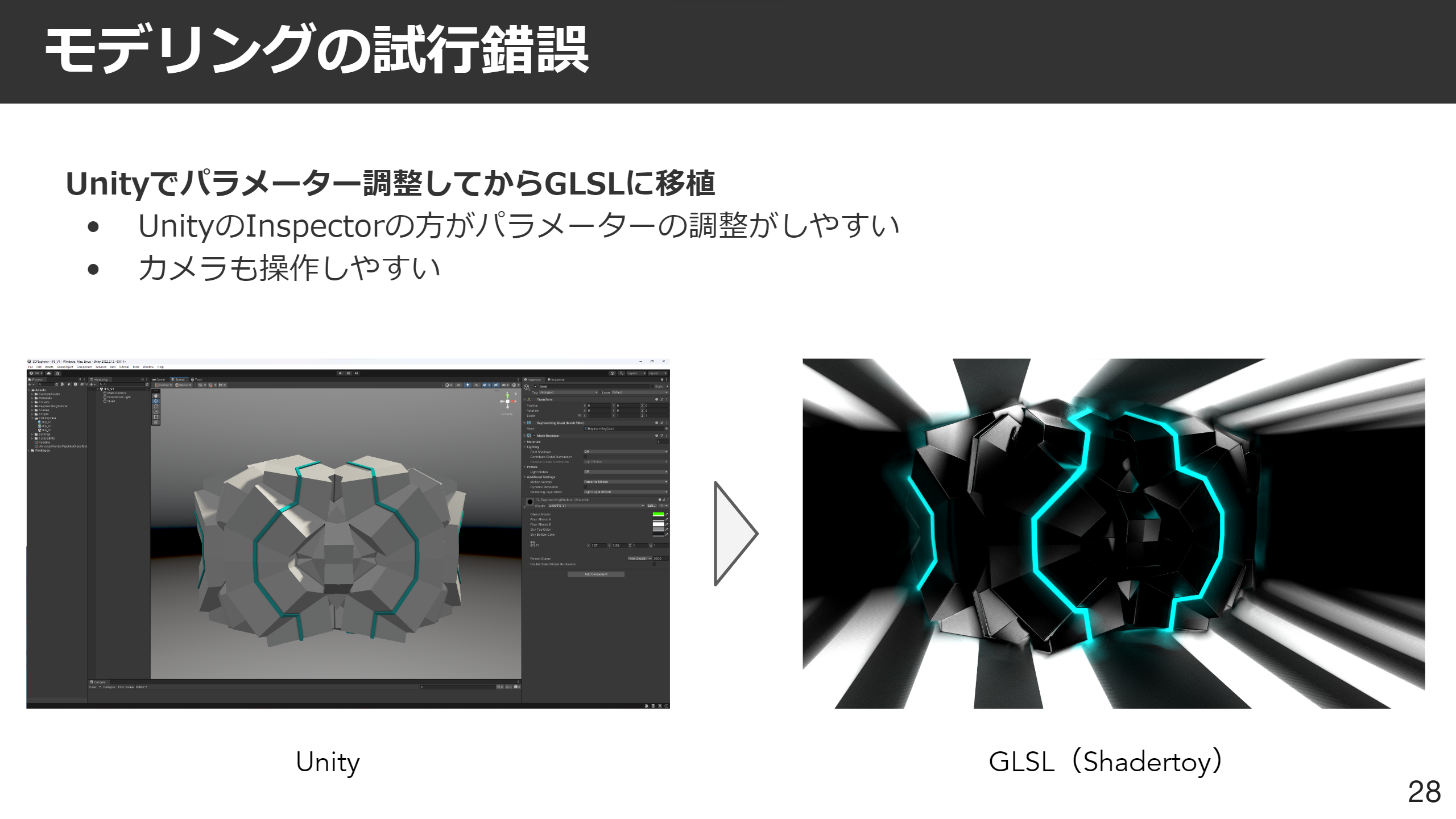 今回はUnityでパラメーター調整してからGLSLに移植する形でモデリングを行いました。