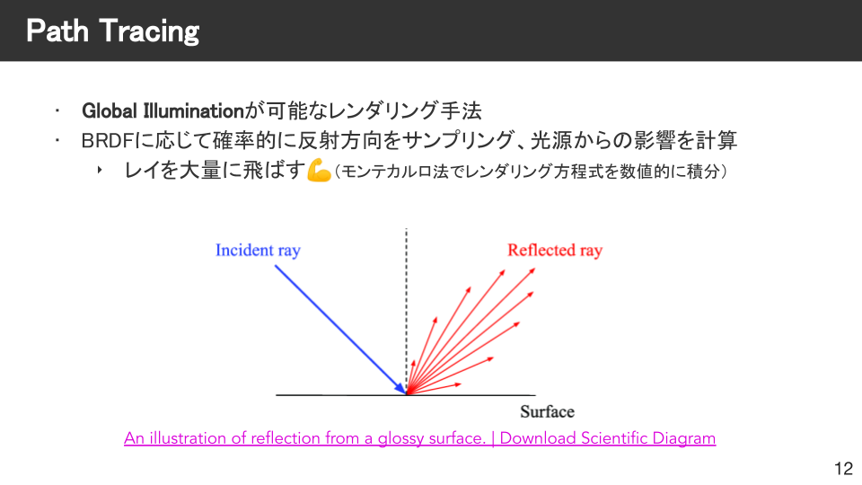 Path TracingはGlobal Illuminationを実現可能でフォトリアルなグラフィックスが得意な手法です。