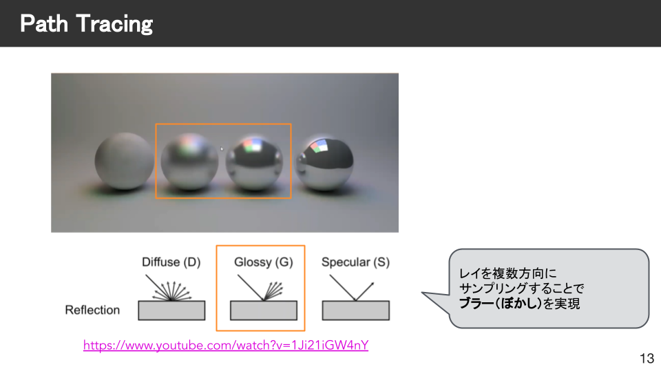 Glossyなマテリアルでは、球体の周囲の映り込みがブラー(ぼかし)されていることが分かります。このブラーは、レイを複数方向にサンプリングし、その結果を平均することで実現されています。