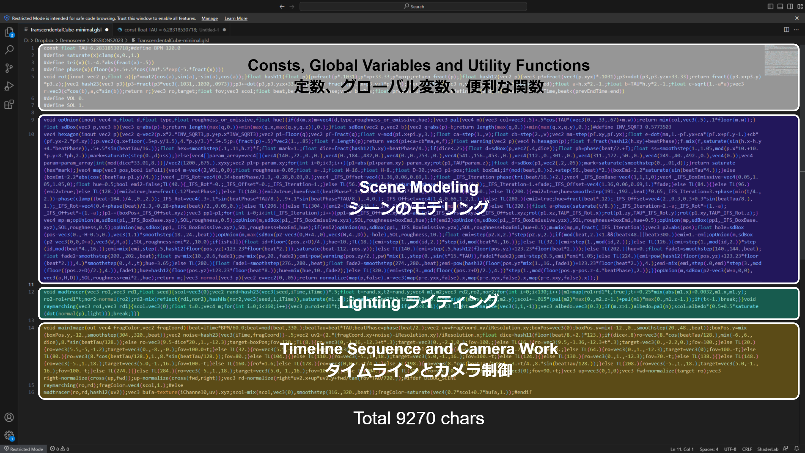 この9270文字のGLSLシェーダーに、映像のすべてが実装されています。