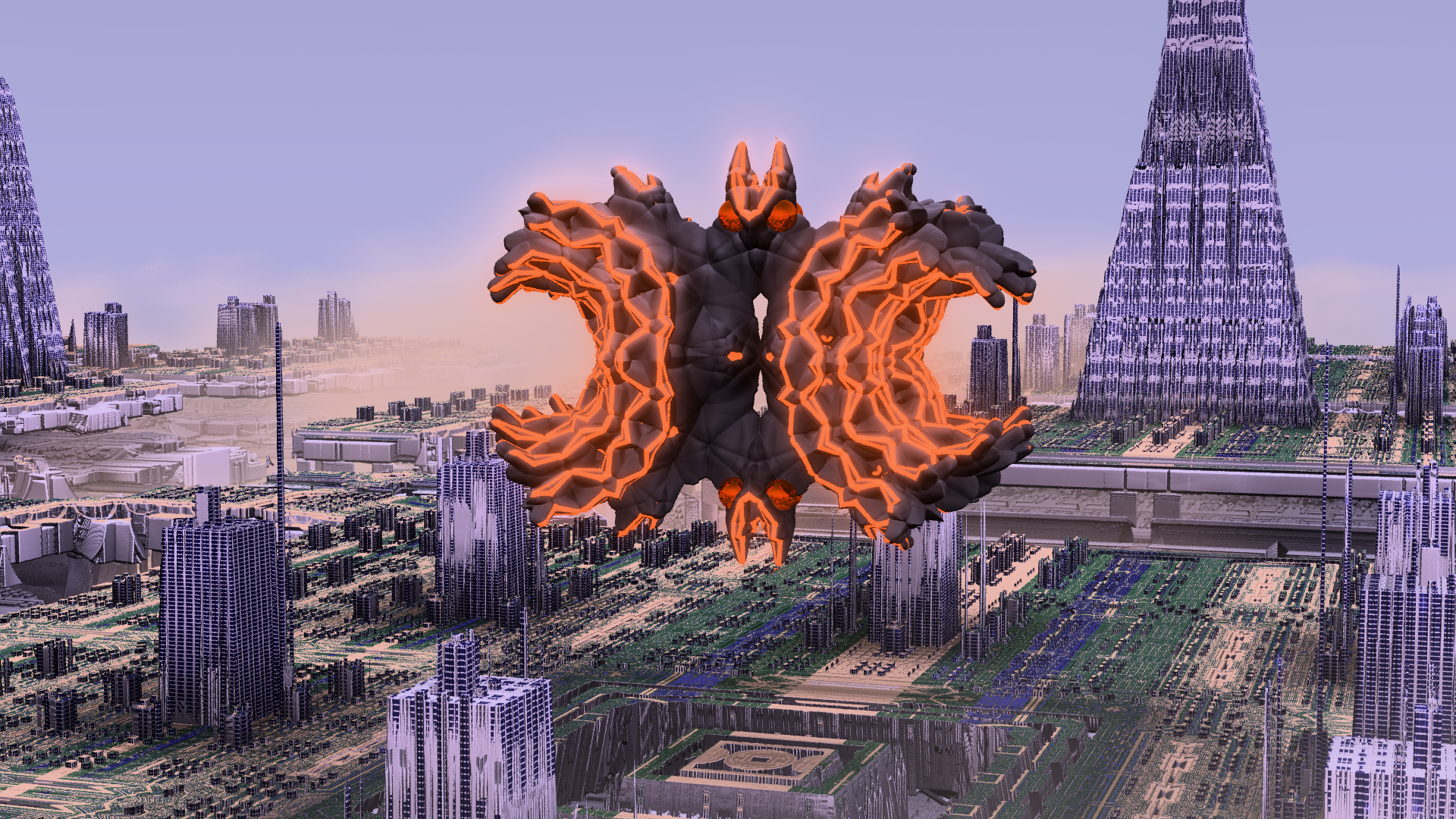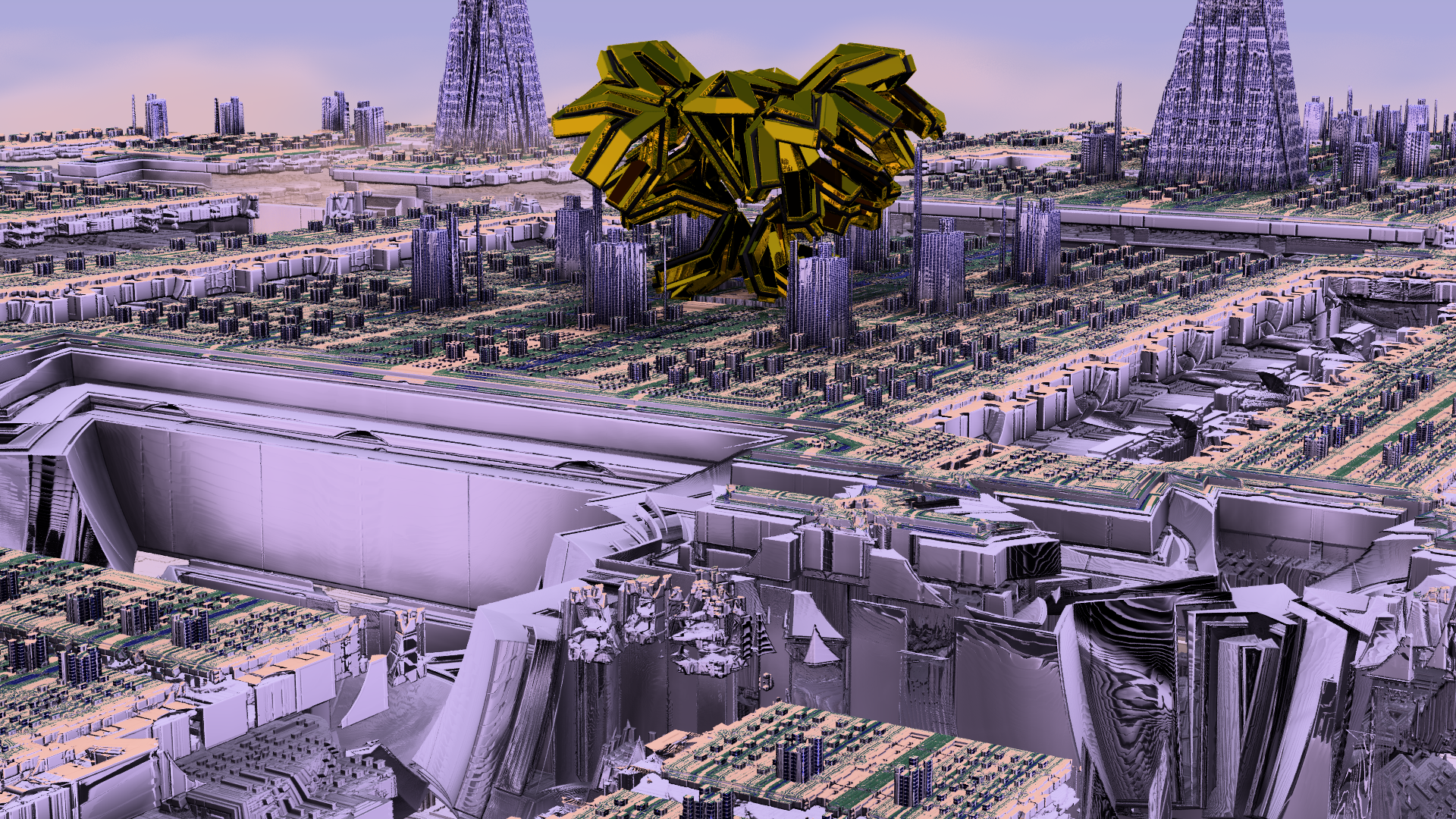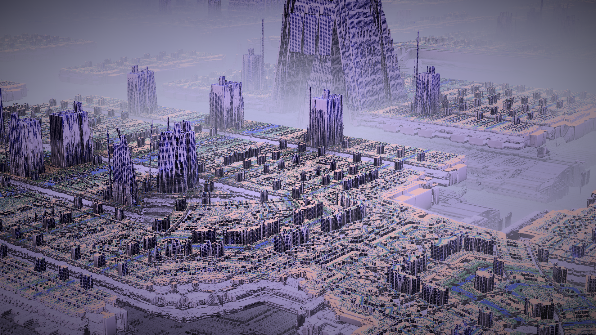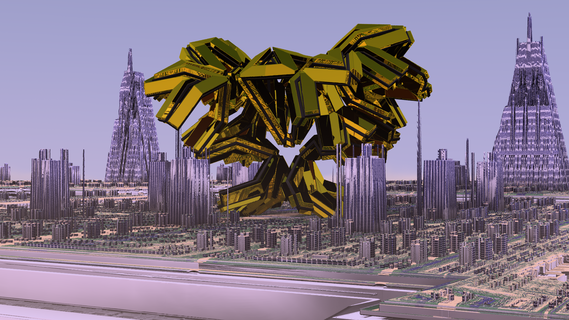 ビルのような突起のついたMandelboxをベースに、Unityを使ってパラメーターを調整しながら街の形状に仕上げました。