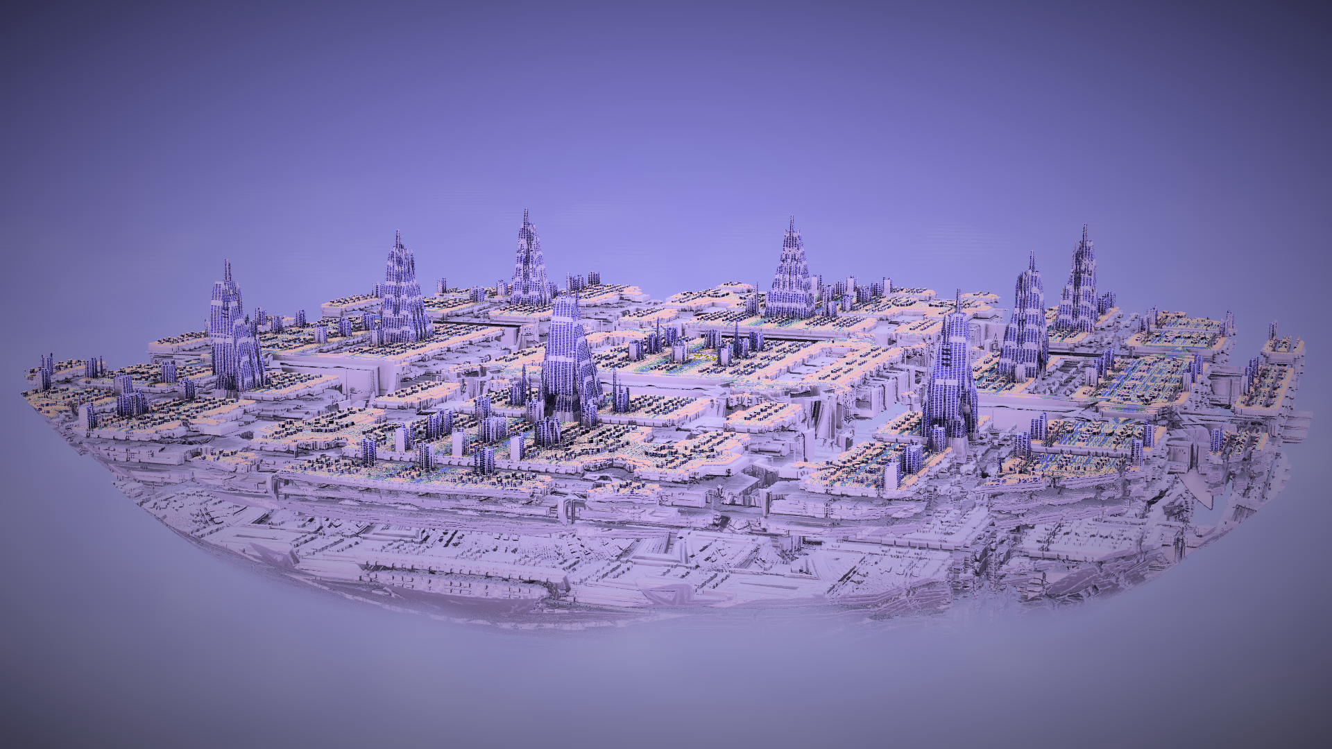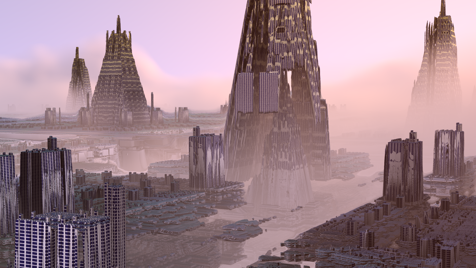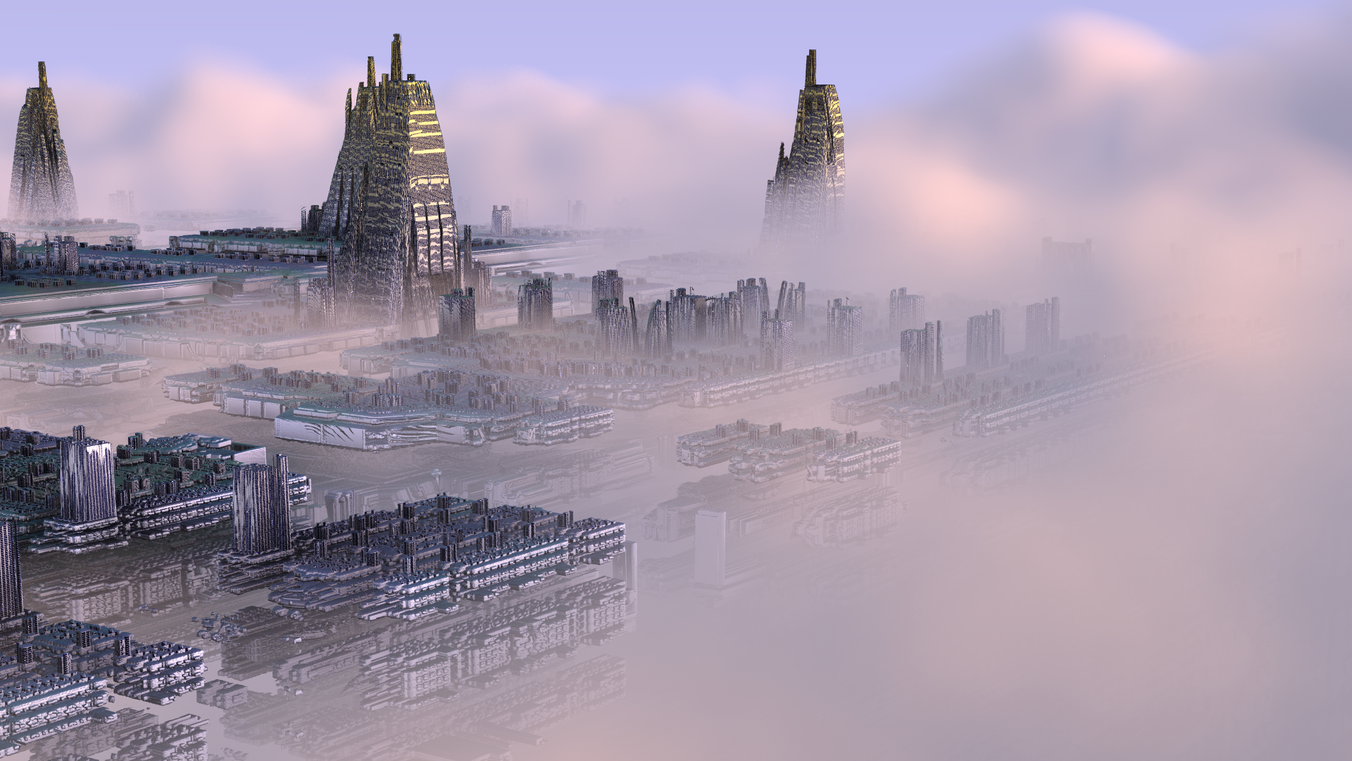 ビルのような突起のついたMandelboxをベースに、Unityを使ってパラメーターを調整しながら街の形状に仕上げました。