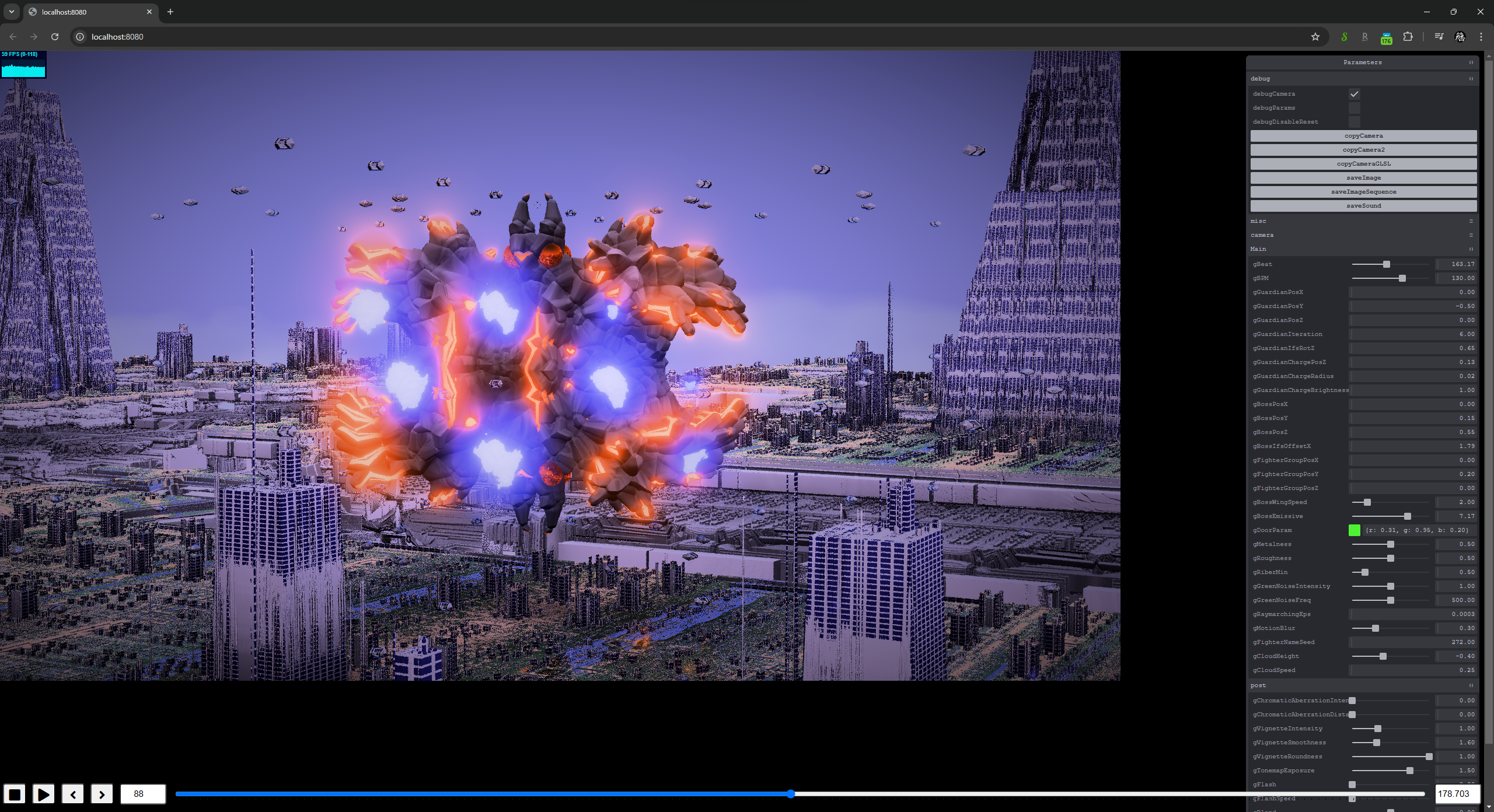 これまでの作品も多少ストーリー性はありましたが、アブストラクトなモデリングが多かったため、特撮という非アブストラクトなテーマで映像を作るのにはかなり苦労しました。『Transcendental Cube』では通常のカメラワークを乱数で生成していましたが、今回はカットごとにカメラワークを調整する必要があったため、過去作品と比べると工数が大幅に増えました。